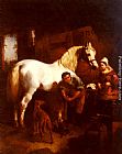 We offer 100% handmade reproduction of A Favorite Coach Horse and Dog in a Stable painting and frame