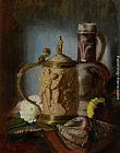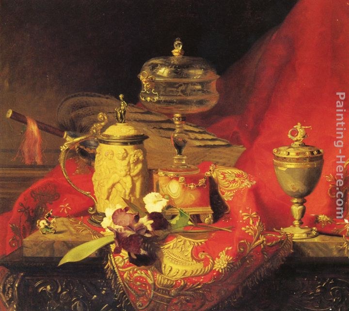 We offer 100% handmade reproduction of A Still Life With Iris And Urns On A Red Tapestry painting and frame