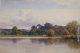 We offer 100% handmade reproduction of An Extensive River Landscape With A Young Girl Balancing On A Gate painting and frame