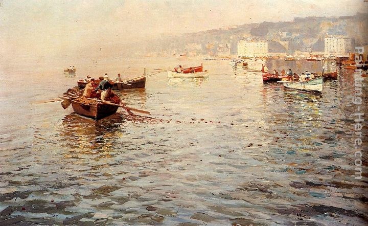 Beautiful, original hand-painted artwork in your home. Fishing Vessels Off A Coast based on the masters' works of Attilio Pratella.