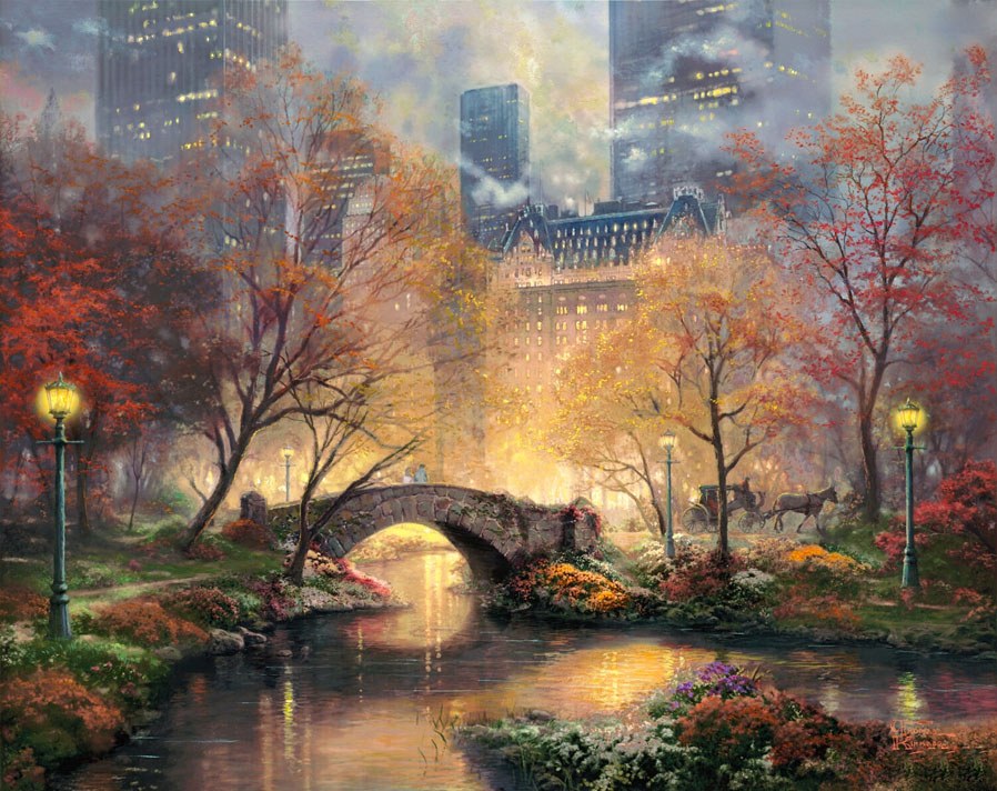 Beautiful, original hand-painted artwork in your home. Central Park in the Fall based on the masters' works of Thomas Kinkade.