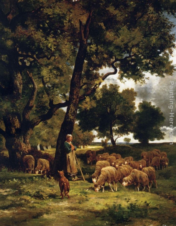 Charles Emile Jacque A Shepherdess with her Flock near a Stream