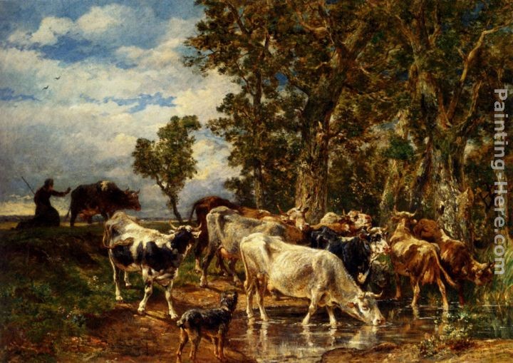 Charles Emile Jacque Troupeau De Vaches A L'Abreuvoir Painting