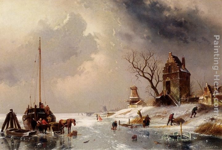 We offer 100% handmade reproduction of Figures Loading A Horse-Drawn Cart On The Ice painting and frame