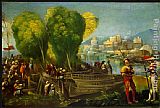 We offer 100% handmade reproduction of Circe and her Lovers in a Landscape painting and frame