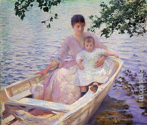 This Edmund Charles Tarbell Mother and Child in a boat painting is oil on canvas. We offer original oil painting, stretched canvas and large framed art, but do not offer poster, print or giclee for this Edmund Charles Tarbell Mother and Child in a boat.