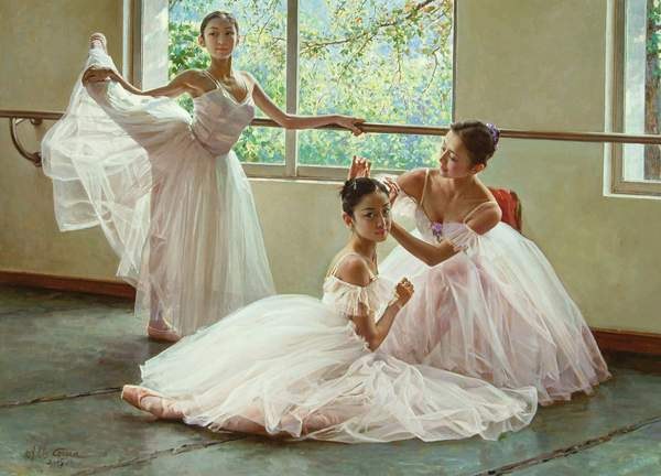 This Guan zeju Exercise at the window painting is oil on canvas. We offer original oil painting, stretched canvas and large framed art, but do not offer poster, print or giclee for this Guan zeju Exercise at the window.
