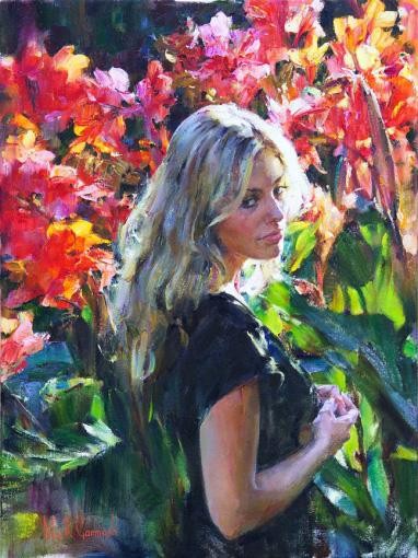 This Garmash CONVERSING WITH FLOWERS painting is oil on canvas. We offer original oil painting, stretched canvas and large framed art, but do not offer poster, print or giclee for this Garmash CONVERSING WITH FLOWERS.