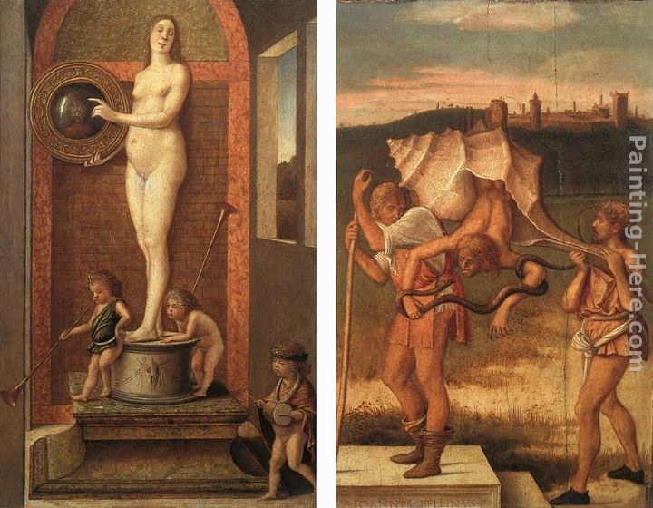 This Giovanni Bellini Four Allegories Prudence and Falsehood painting is oil on canvas. We offer original oil painting, stretched canvas and large framed art, but do not offer poster, print or giclee for this Giovanni Bellini Four Allegories Prudence and Falsehood.