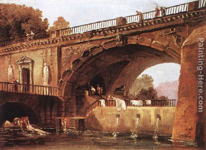 Beautiful, original hand-painted artwork in your home. Washerwomen below a Bridge based on the masters' works of Hubert Robert.