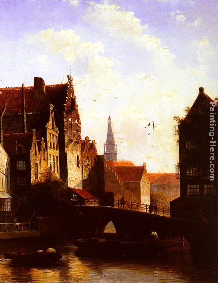 Jan Jacob Coenraad Spohler Figures on a Bridge in a Dutch Town Painting