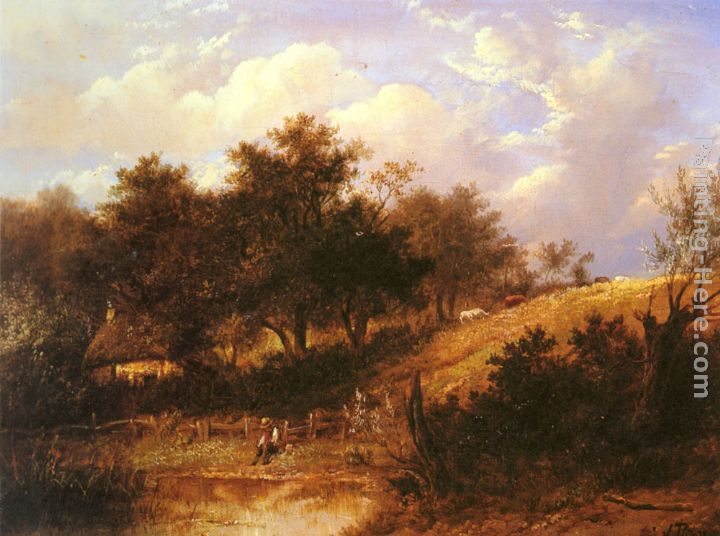 We offer 100% handmade reproduction of Landscape with figure resting beside a pond painting and frame
