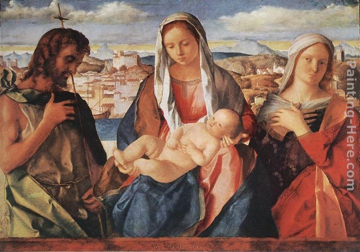We offer 100% handmade reproduction of Madonna and Child with St. John the Baptist and a Saint painting and frame