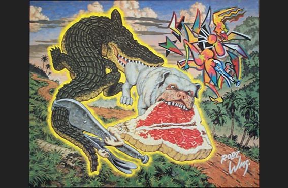 This Robert Williams Masterlink in the Pain Chain painting is oil on canvas. We offer original oil painting, stretched canvas and large framed art, but do not offer poster, print or giclee for this Robert Williams Masterlink in the Pain Chain.