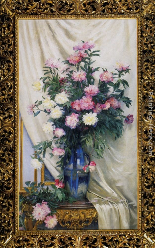We offer 100% handmade reproduction of Peonies in a Blue Vase on a Draped Regency Giltwood Console Table painting and frame
