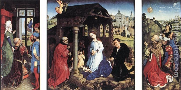 This Rogier van der Weyden Pierre Bladelin Triptych painting is oil on canvas. We offer original oil painting, stretched canvas and large framed art, but do not offer poster, print or giclee for this Rogier van der Weyden Pierre Bladelin Triptych.
