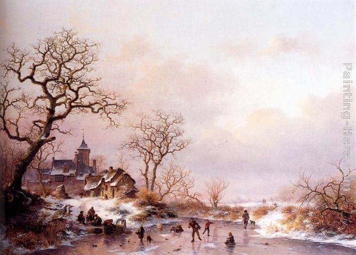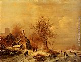 Frederik Marianus Kruseman A Winterlandscape With A Horserider On A Track Passing A Farmhouse, Skaters On The Ice Beyond