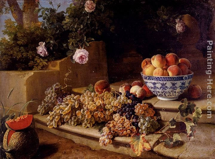 Alexandre-Francois Desportes Still Life Of Grapes, Peaches In A Blue And White Porcelain Bowl And A Melon, Resting On A Stone Stairway