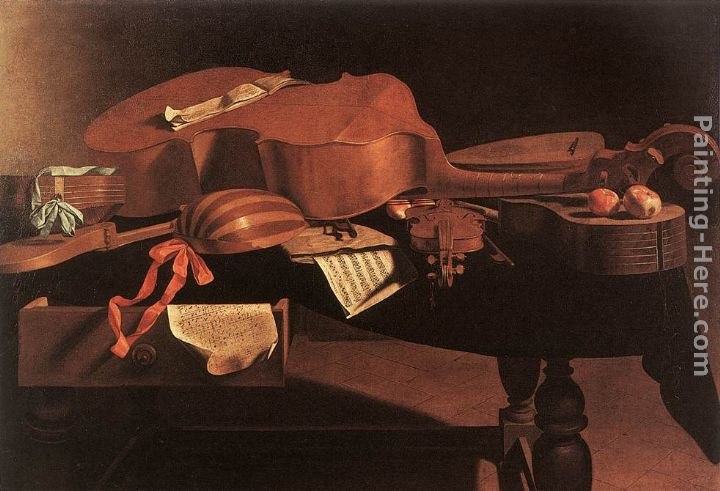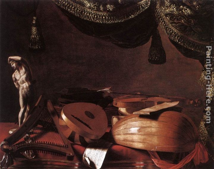We offer 100% handmade reproduction of Still-Life with Musical Instruments and a Small Classical Statue painting and frame