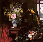 Olaf August Hermansen A Still Life With A Vase, Basket And Parrot