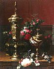 Jean-Baptiste Robie A Bouquet of Roses and other Flowers in a Glass Goblet with a Chinese Lacquer Box and a Nautilus Cup on a red Velvet draped Table