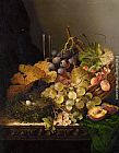 Edward Ladell Pears, Grapes, A Greengage, Plums A Stoneware Flask And A Wicker Basket On A Wooden Ledge
