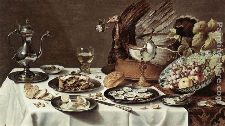 This Pieter Claesz Still Life with Turkey Pie painting is oil on canvas. We offer original oil painting, stretched canvas and large framed art, but do not offer poster, print or giclee for this Pieter Claesz Still Life with Turkey Pie.