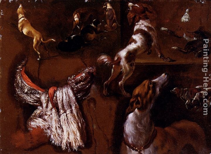 We offer 100% handmade reproduction of Studies Of Spaniels And Whippets, And A Study Of A White Headdress painting and frame