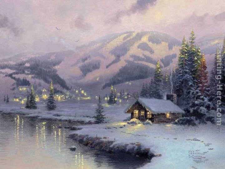 This Thomas Kinkade Olympic Mountain Evening painting is oil on canvas. We offer original oil painting, stretched canvas and large framed art, but do not offer poster, print or giclee for this Thomas Kinkade Olympic Mountain Evening.
