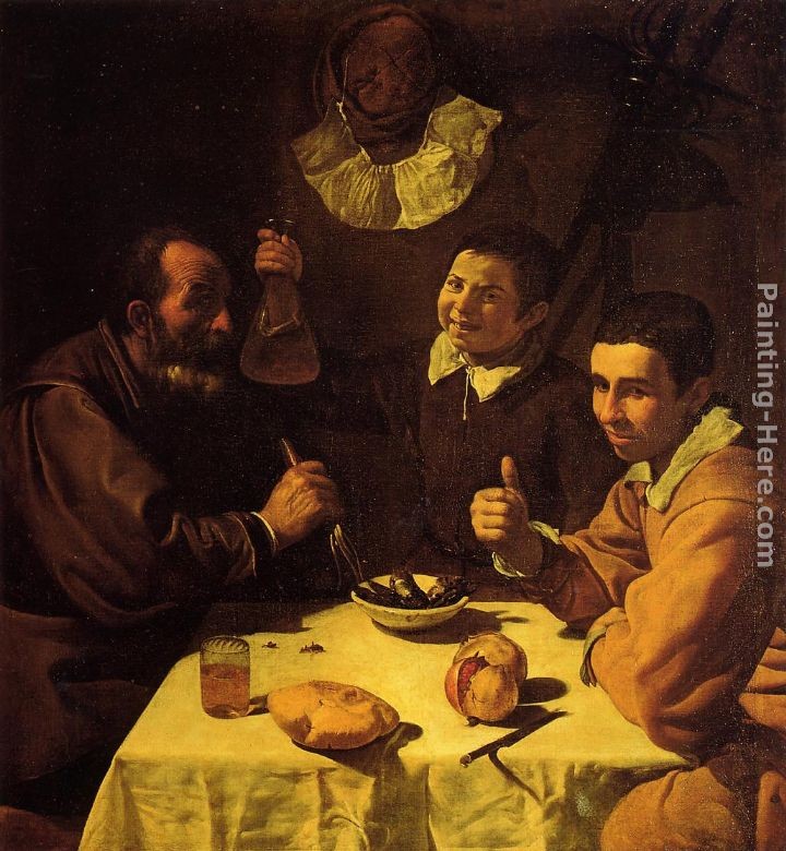 This Diego Rodriguez de Silva Velazquez Three Men at a Table painting is oil on canvas. We offer original oil painting, stretched canvas and large framed art, but do not offer poster, print or giclee for this Diego Rodriguez de Silva Velazquez Three Men at a Table.