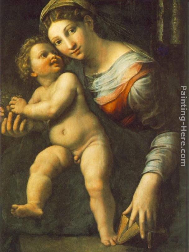 This Giulio Romano Virgin with the Child painting is oil on canvas. We offer original oil painting, stretched canvas and large framed art, but do not offer poster, print or giclee for this Giulio Romano Virgin with the Child.