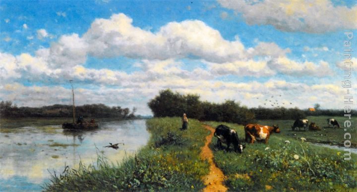 Willem Roelofs Cows Grazing Near a Canal, Schiedam Painting