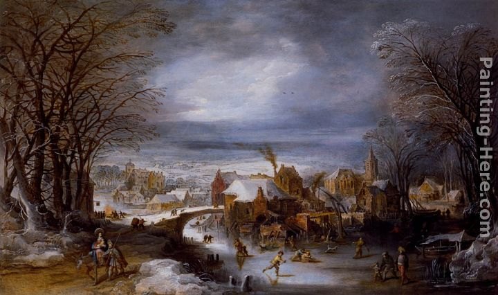 This Joos De Momper Winter landscape painting is oil on canvas. We offer original oil painting, stretched canvas and large framed art, but do not offer poster, print or giclee for this Joos De Momper Winter landscape.