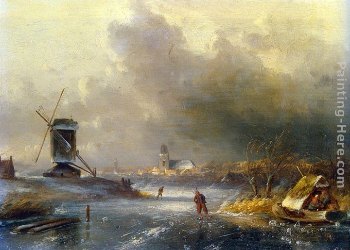 We offer 100% handmade reproduction of Winter Landscape with Skaters on a Frozen River painting and frame