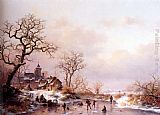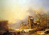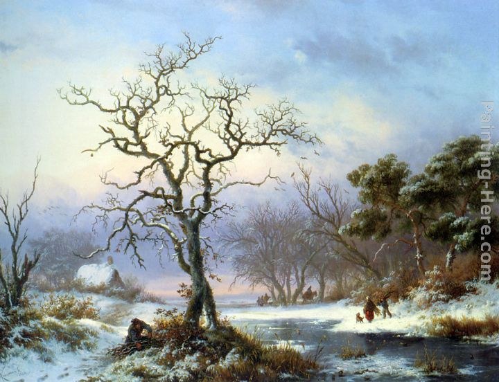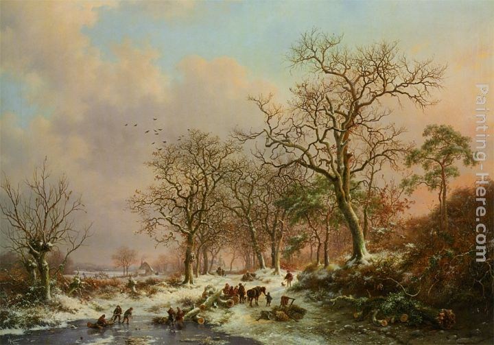 We offer 100% handmade reproduction of Wood gatherers in a winter landscape with a castle beyond painting and frame